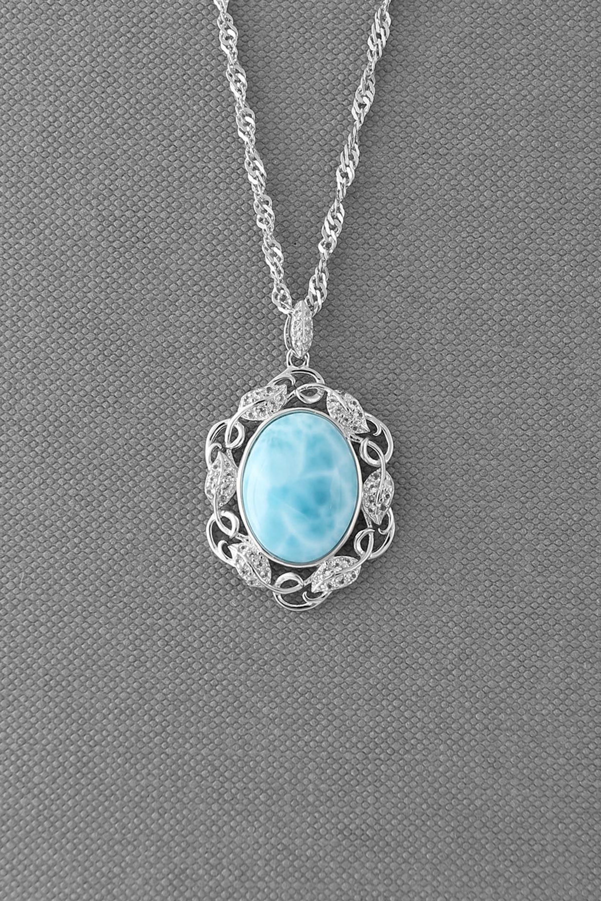 LARIMAR pendant -- rhodium plated, genuine cabouchone 12x16mm oval and white topazs. Item size 34x20mm.