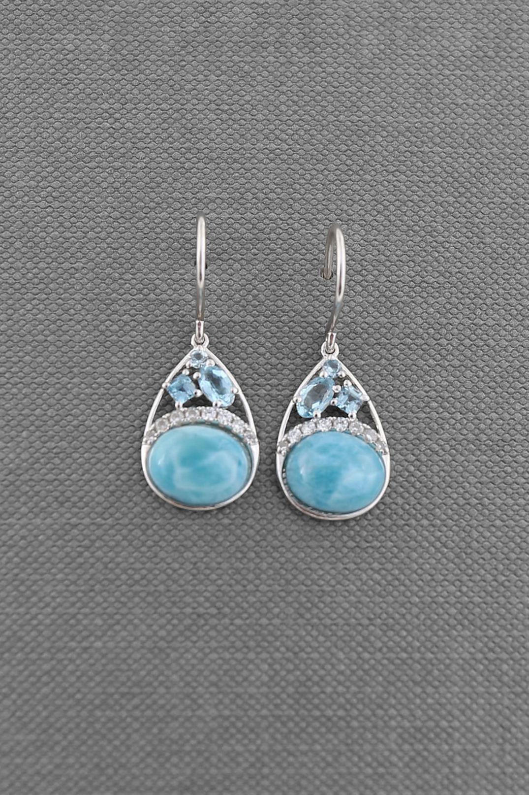 Larimar hooked silver earrings, with genuine AAA grade stone cabs 8x10mmx2 oval natural swiss blue topazs 2mmx2 round/3x5mmx2 oval/2.5mmx2.5mmx2 square and small white zirconias. Item size 12x28mm. Matching pendant #