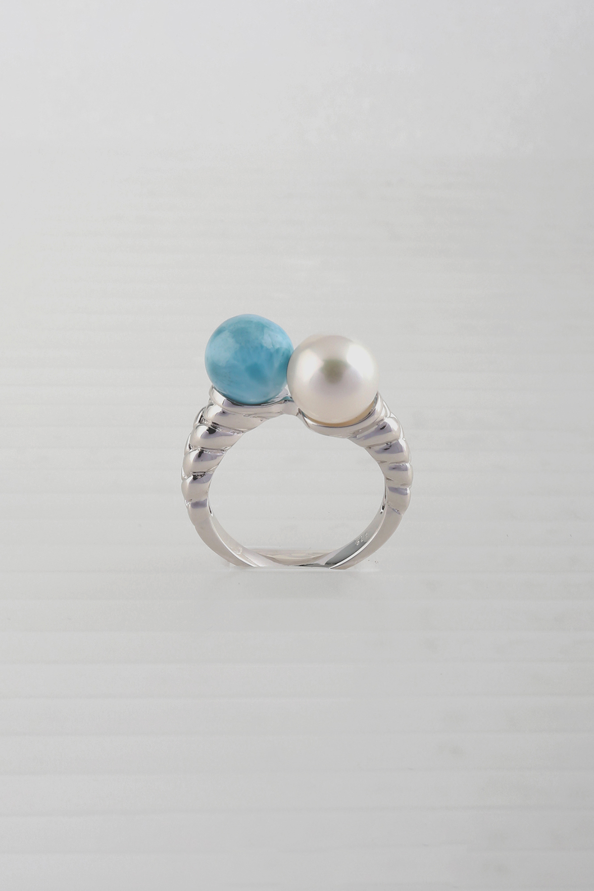 Beads larimar ring for ladies, 925 sterling silver piece with genuine cultured pearl 8-8.5mm and larimar bead 8-8.5mm.