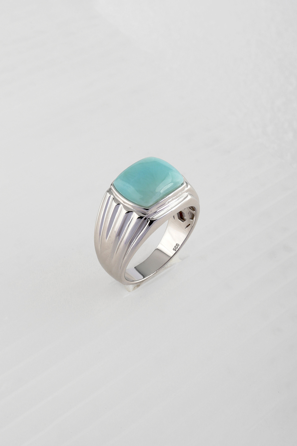Larimar MEN's RING -- in 925 sterling silver and rhodium finish. The piece with line details ring band was set by a high quality genuine inlaid larimar cab.