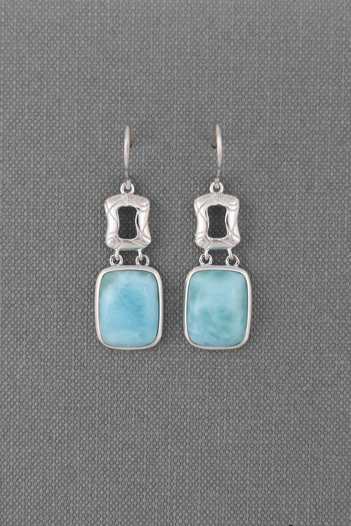 Larimar silver earring, rhodium plated pair, genuine high quality larimar cabs 11x13 mm long cushion. Item size 45x14mm. Matched pendant # 100-04-P and bracelet # 100-04-B.