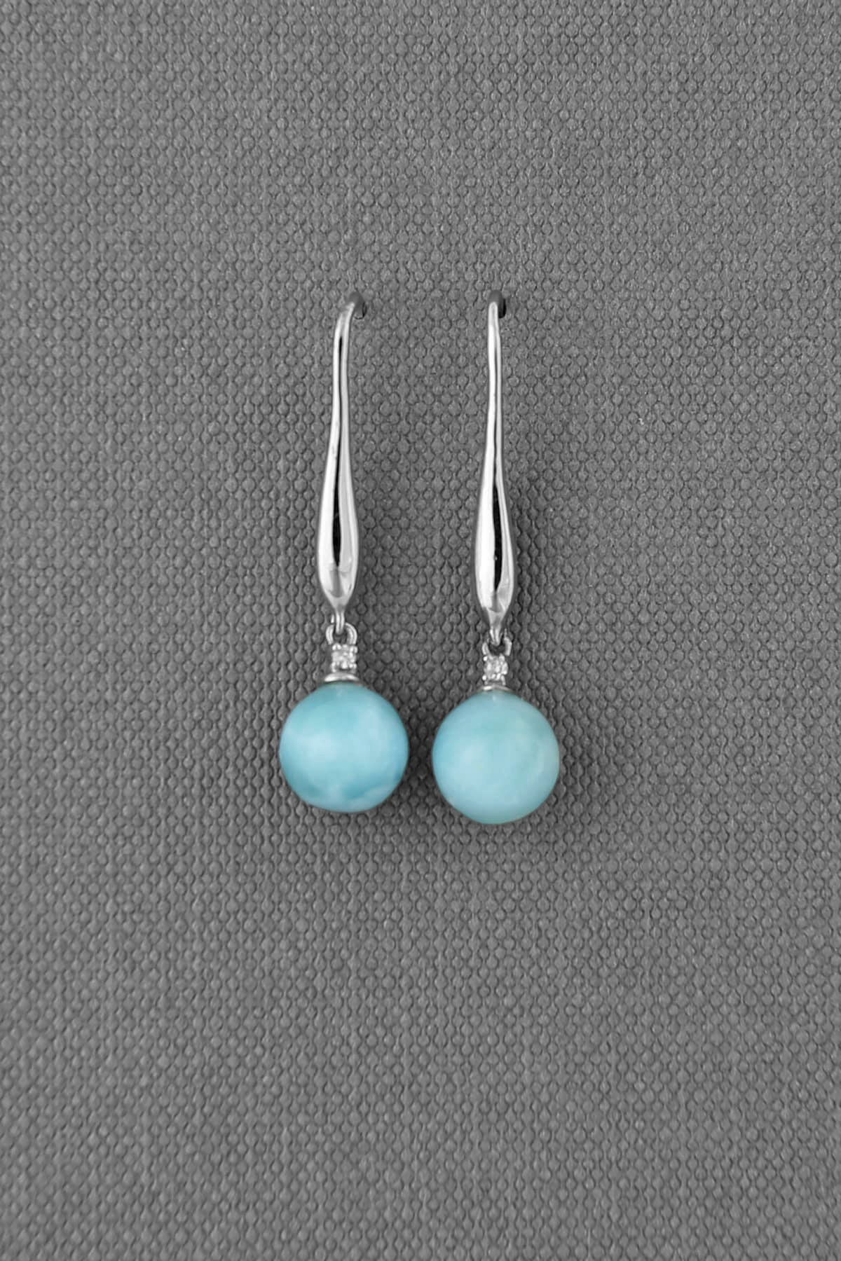 High polished long hooked earrings in sterling silver, with dropped genuine clear zirconia and larimar bead 8mmx2. Item size 35x8mm.