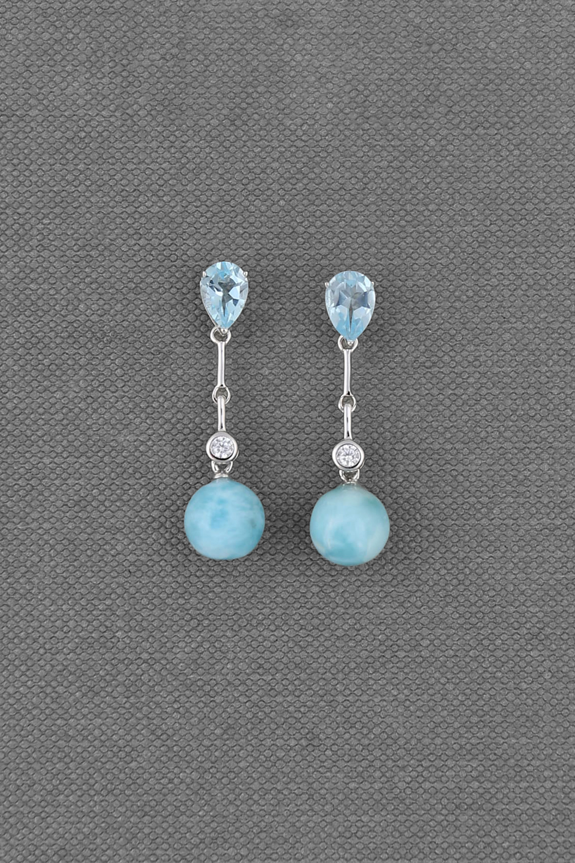 Dangling silver earrings with sparkle genuine blue topaz 6x8mmx2 pear as part of post set, dropped with small white zirconia 2.5mmx2 round and larimar beads 8mmx2. Item size 31x8mm.